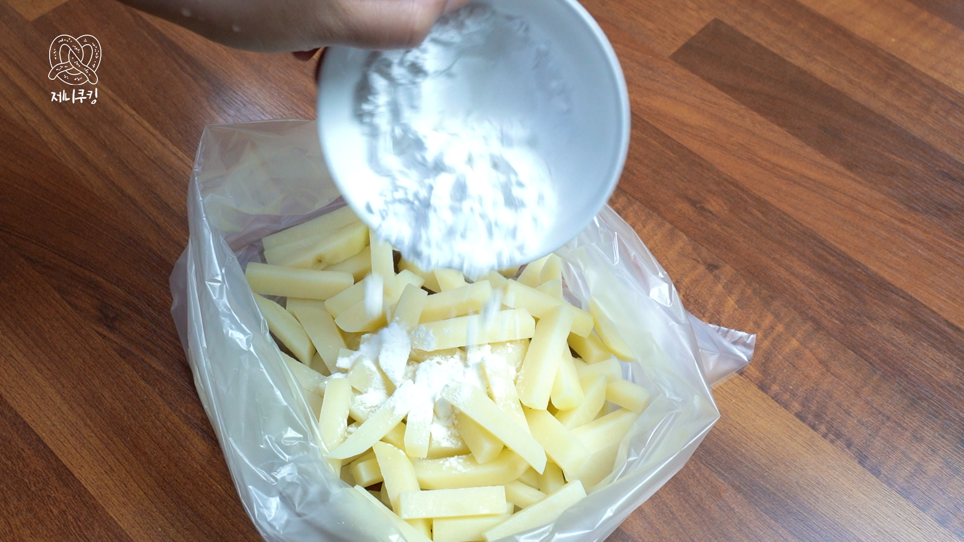 3. 봉지에 감자 전분 3 큰 술과 감자넣고 흔든다. 냄비에 튀김유넣고 1차로 3분간 튀긴다. 기름 빼주고 잠시 식힌다.