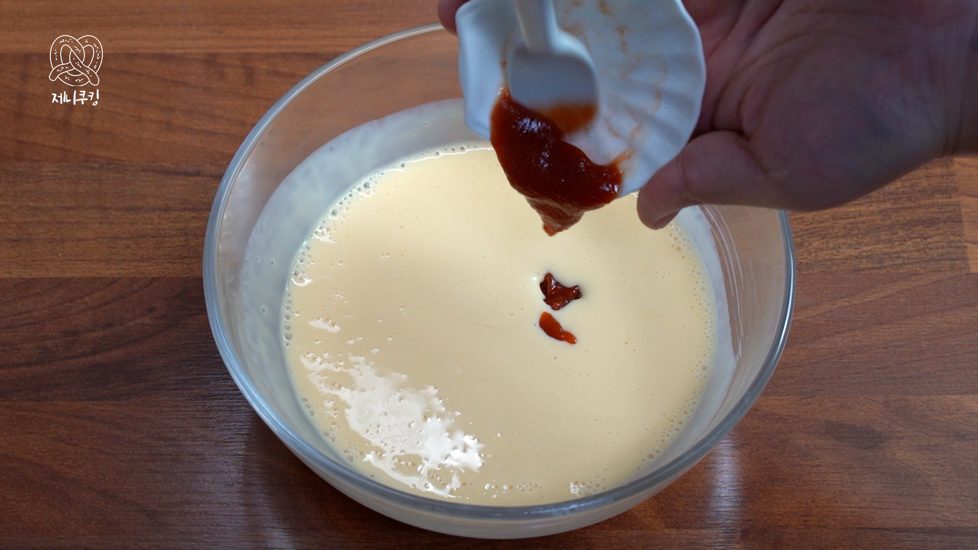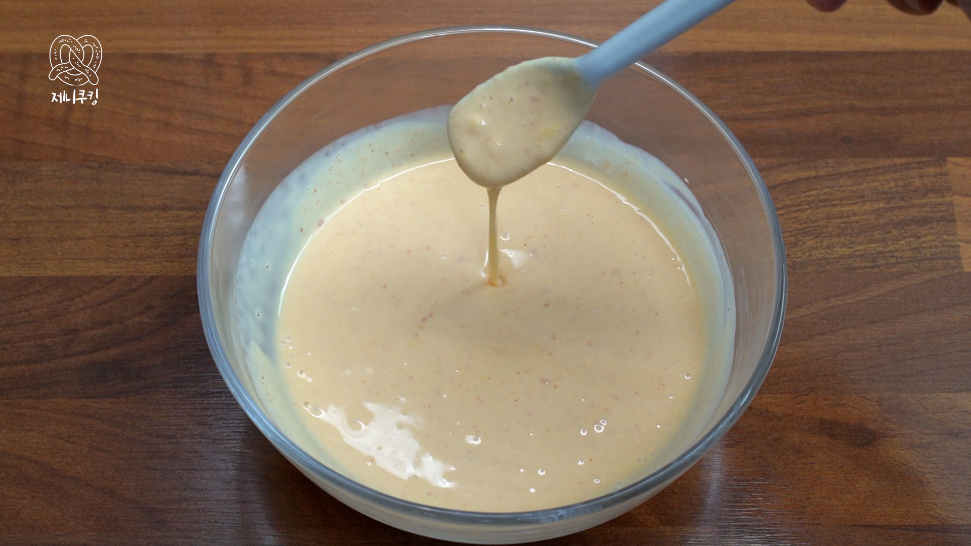 6. 치즈가 녹으면 스리라차 소스 1 큰 술 넣어 잘 섞는다. 환상적인 매콤한 치즈소스 완성