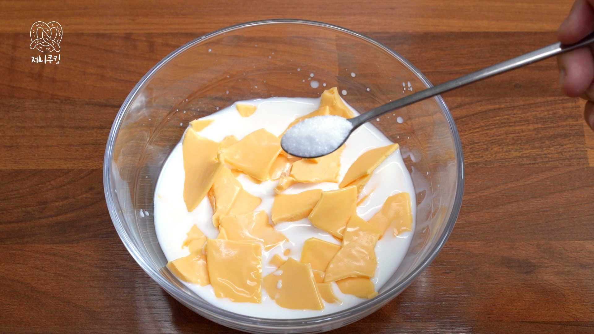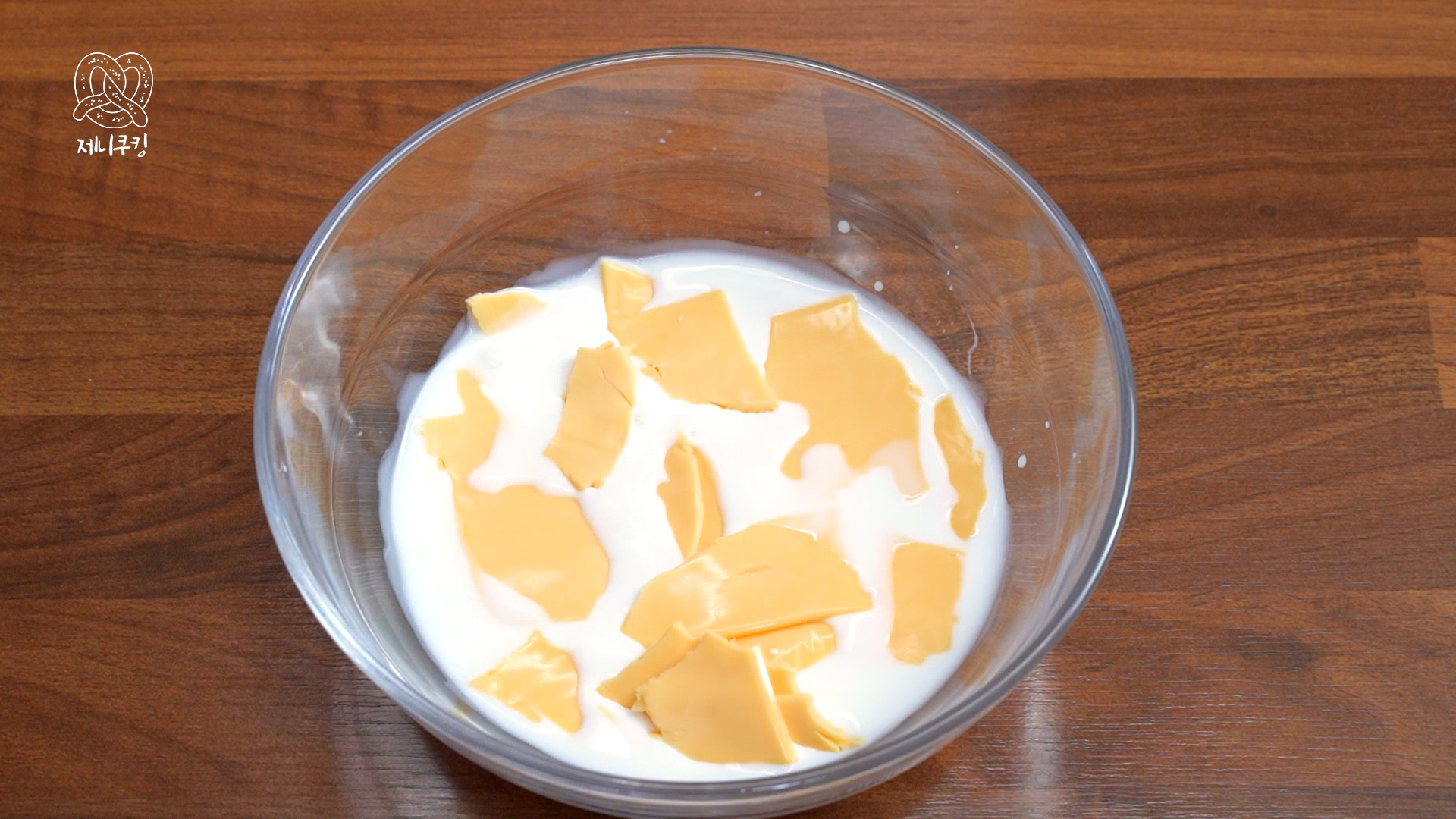 5. 치즈소스 만들기 - 전자렌지 가능 용기에 우유 100ml, 무염 버터 한 조각, 체다치즈 6장 잘게 찢어넣고 설탕 1 작은 술, 소금 한 꼬집 넣어 전자레인지에 30초씩 3번 돌린다. (중간중간 저어서 치즈를 녹인다)