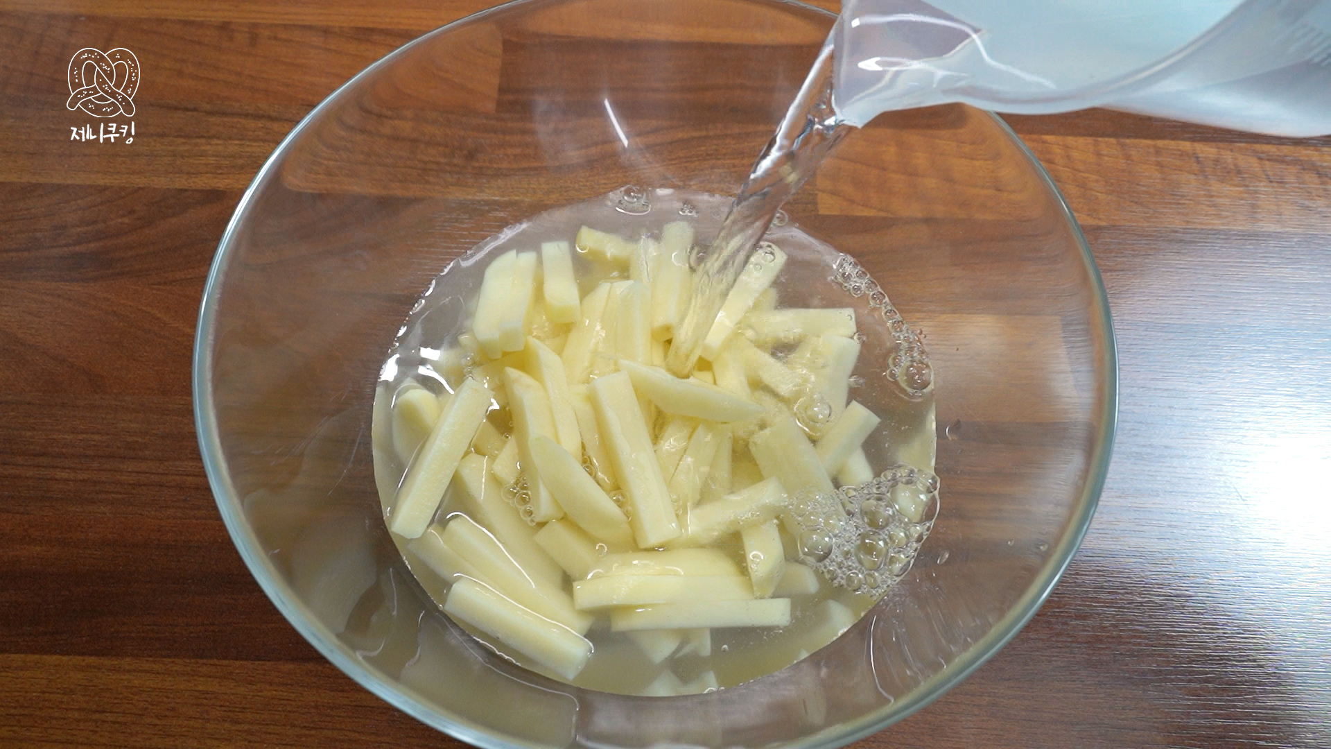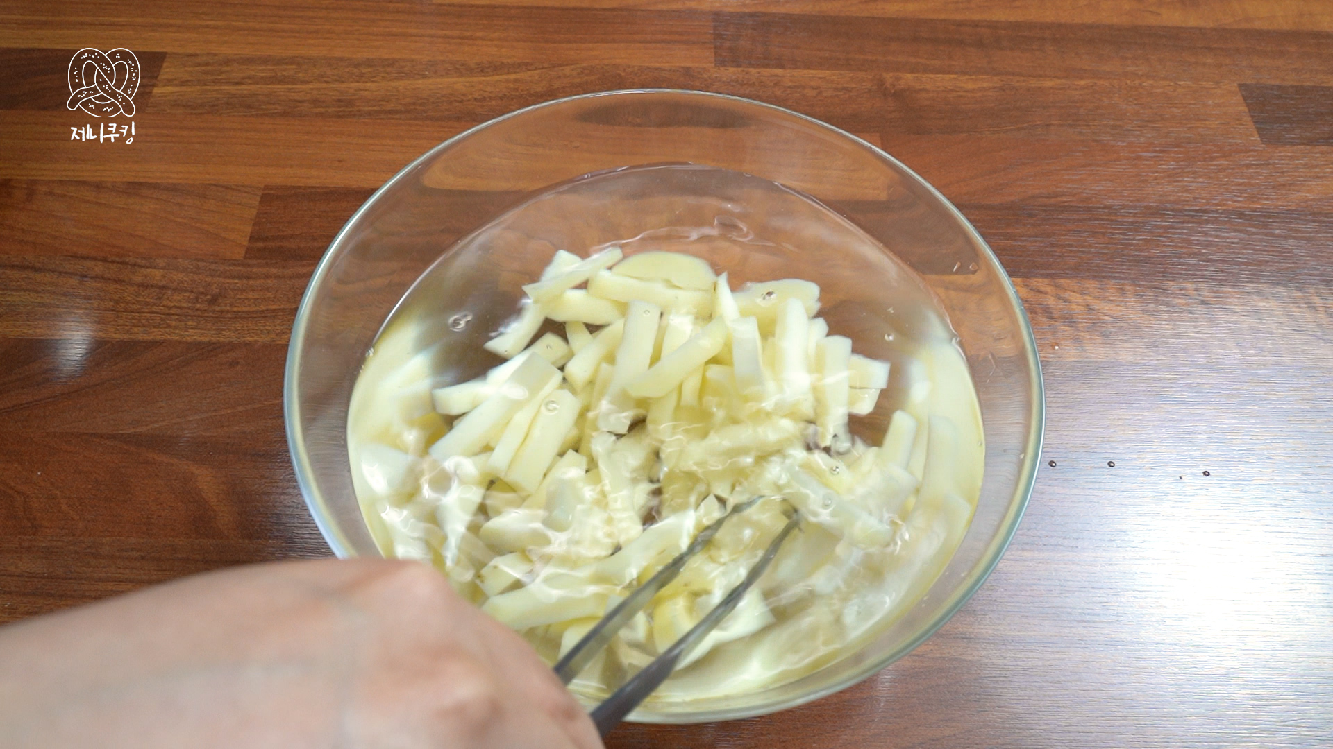 1. 감자의 울퉁불퉁한 부분은 잘라주고 길쭉하게 썬다. 바삭하게 먹고 싶다면 얇게 썰고 포슬포슬하게 먹고 싶다면 도톰하게 썬다. 찬물에 10분간 담가서 전분기를 뺀 뒤 찬물에 한 번 더 헹군다.