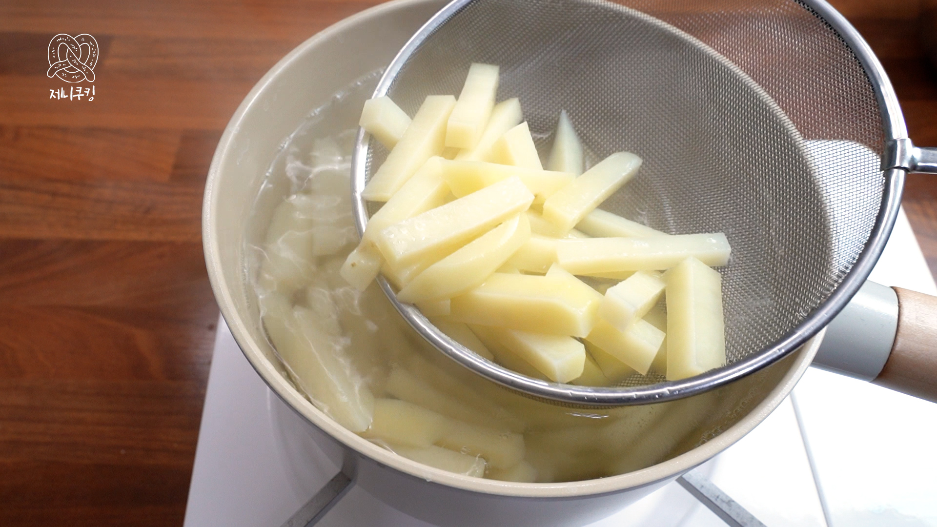 2. 물 1L에 소금 1 큰 술 넣고 끓인다. 감자는 3분만 익힌 뒤 찬물에 담가 식힌다. 키친타월로 물기 제거한다.