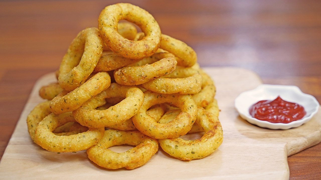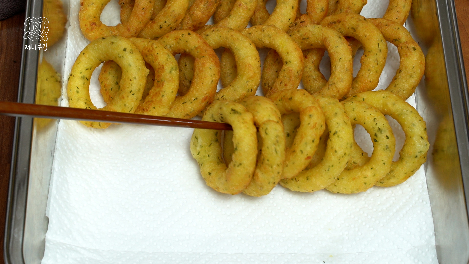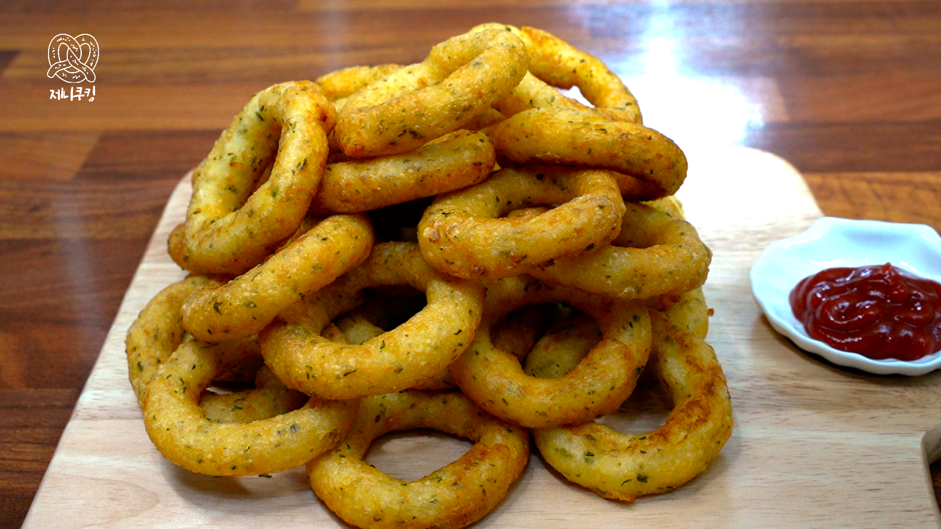 동그란 링 모양의 감자튀김이에요. 바삭한 튀김을 깨물면, 포근포근한 햇감자의 식감과 마늘버터의 풍미가 엄청납니다~^^ 맥주안주로도 너무 좋고, 케첩 찍어 먹는 간식으로도 최고에요. 넉넉히 만들었다가 냉동실에 넣어두고 에프에만 돌리면 갓 튀긴 것 처럼 바삭해요.