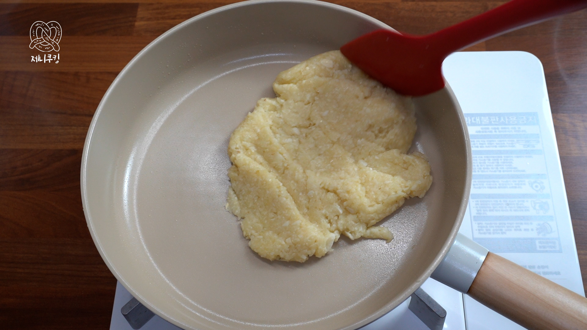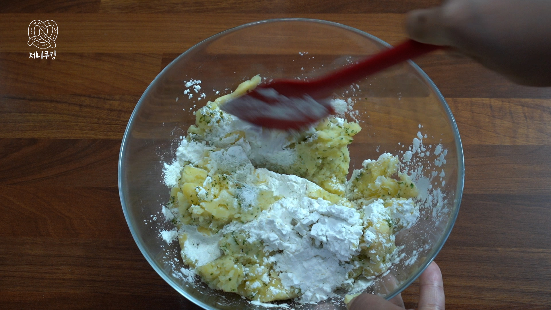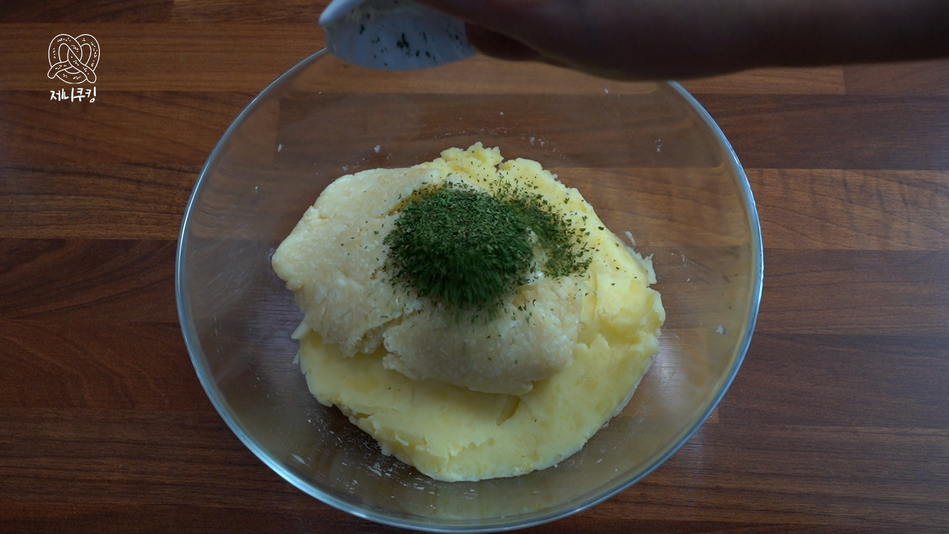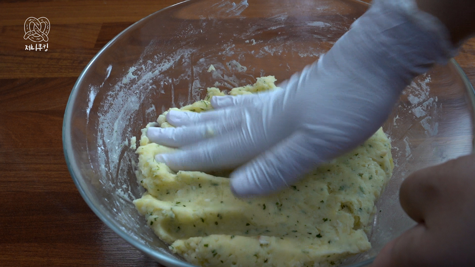 3. 물 1/2컵 넣고 끓이다가 강력분 50g을 넣고 볶아준다. 떡 반죽처럼 한덩이로 뭉쳐지면 으깬감자에 넣고 파슬리 1큰술 넣고 섞는다.