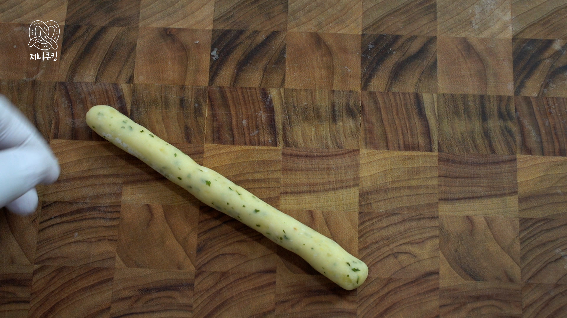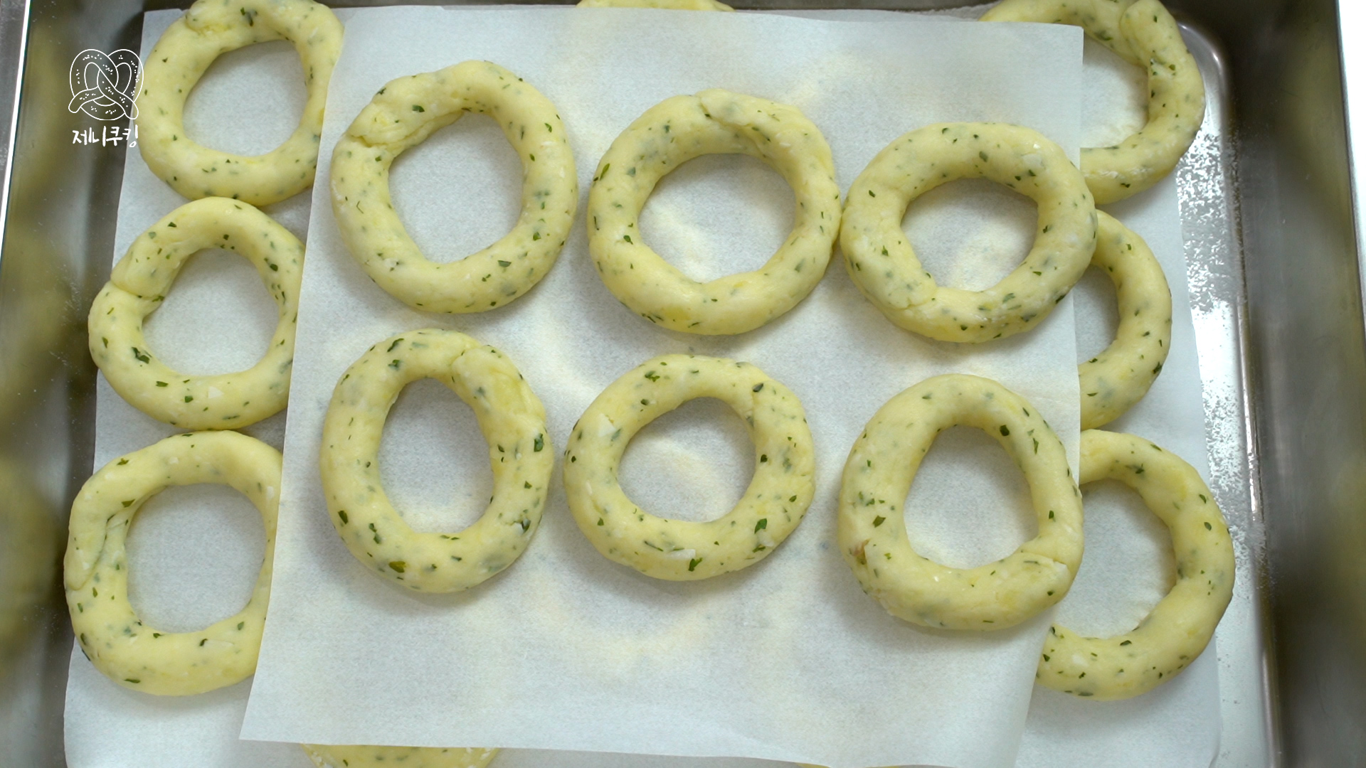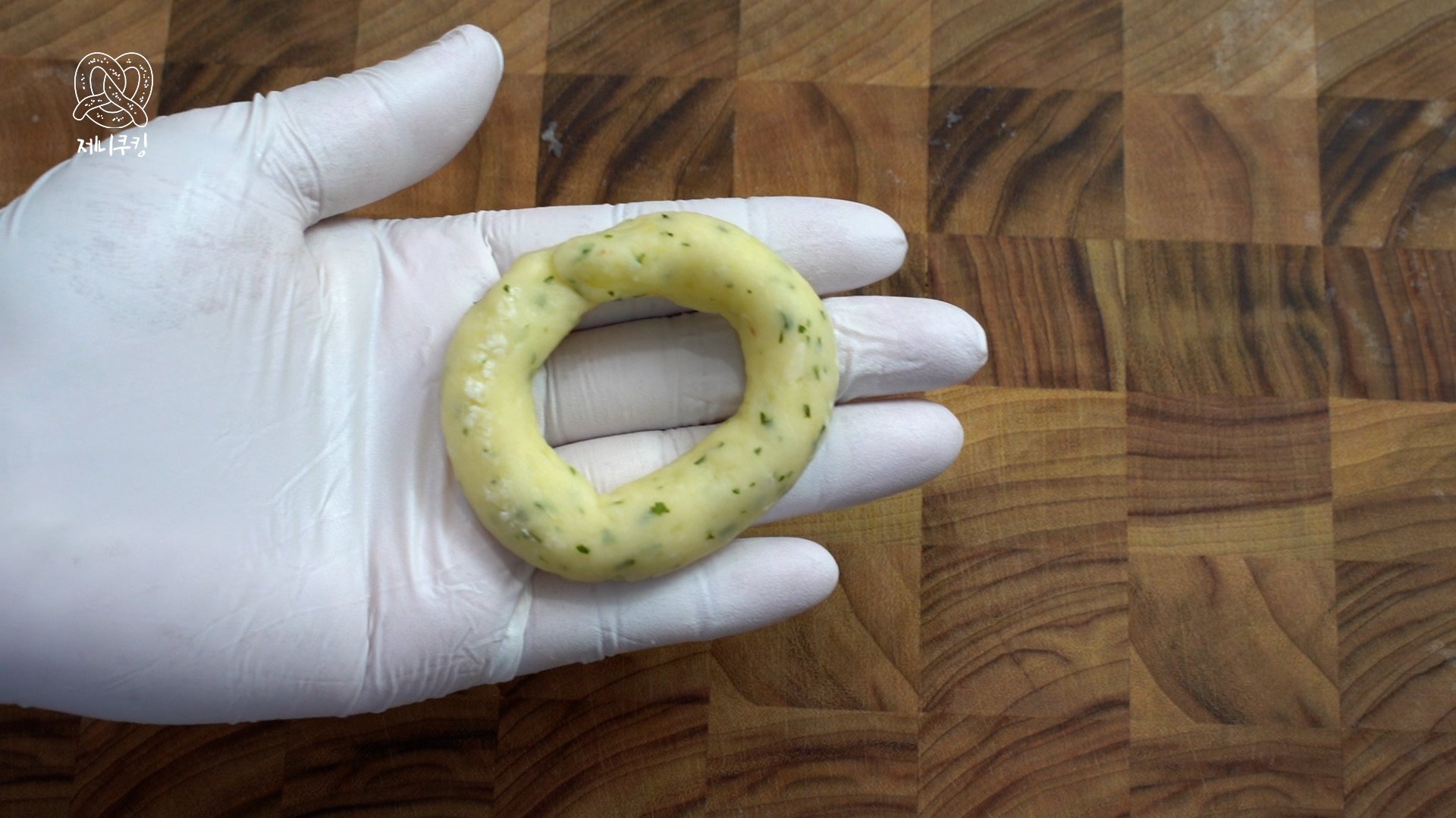 4. 전분을 넣고 섞어주고 손으로 1분간 반죽한다. 새알 크기로 동그랗게 떼어서 양손으로 밀고 양끝을 이어서 링모양을 만든다.