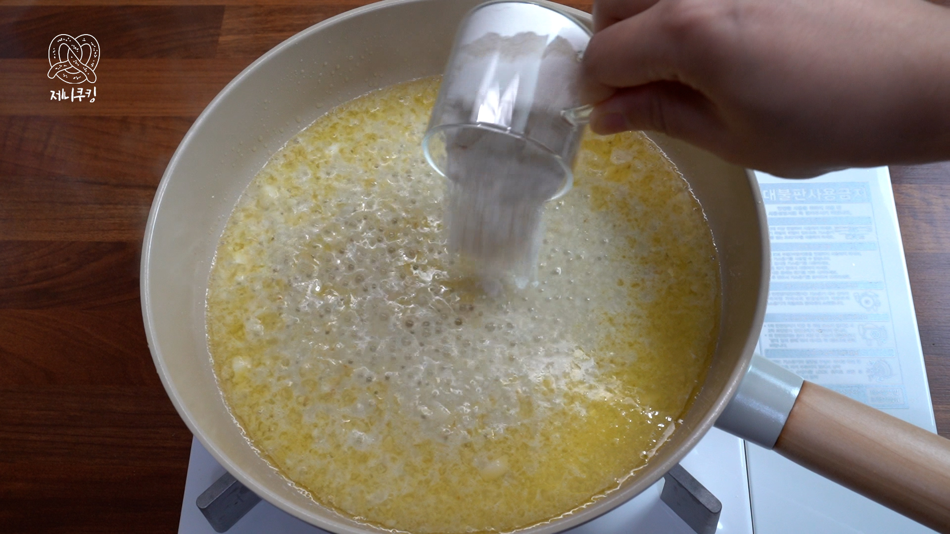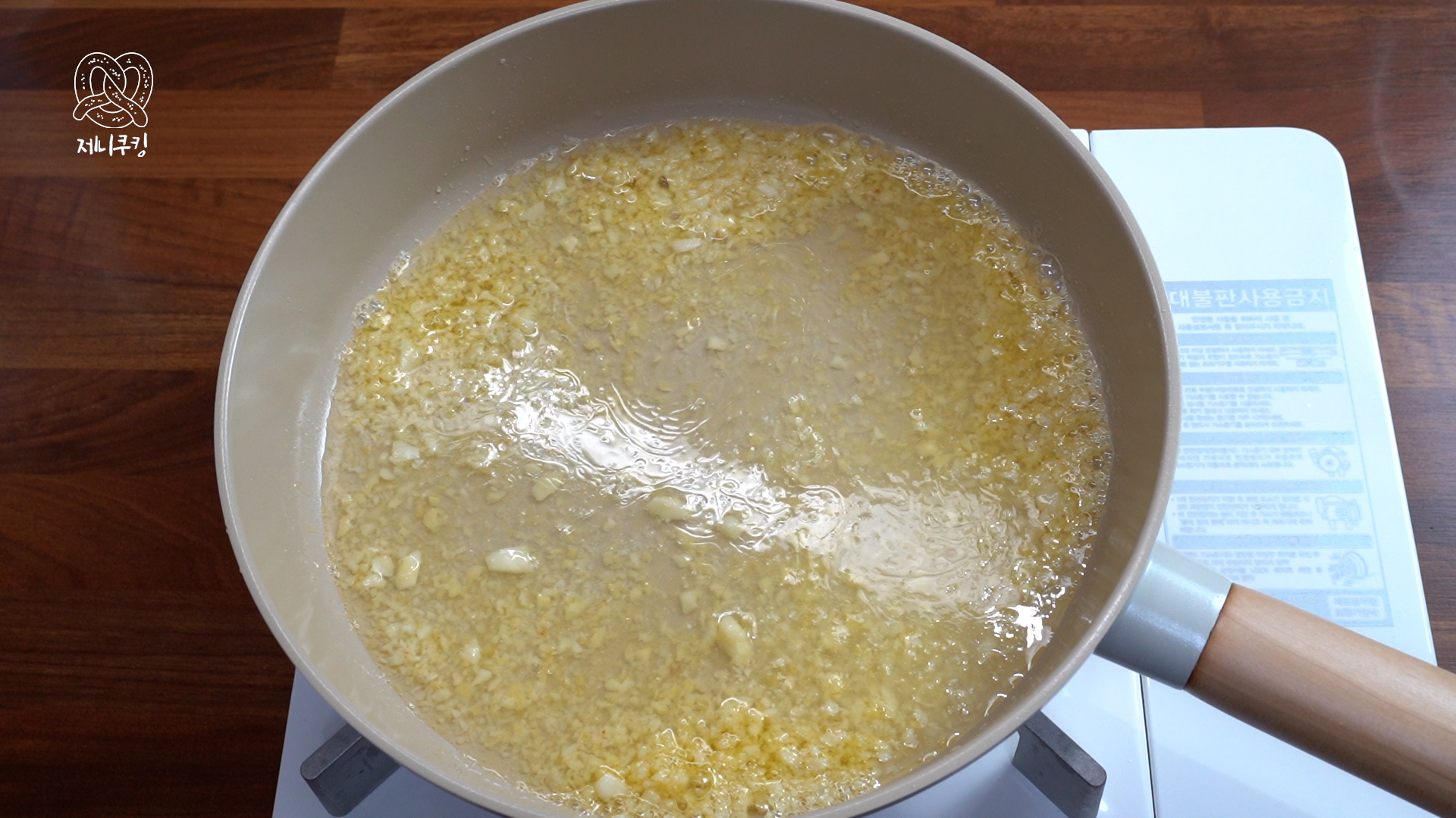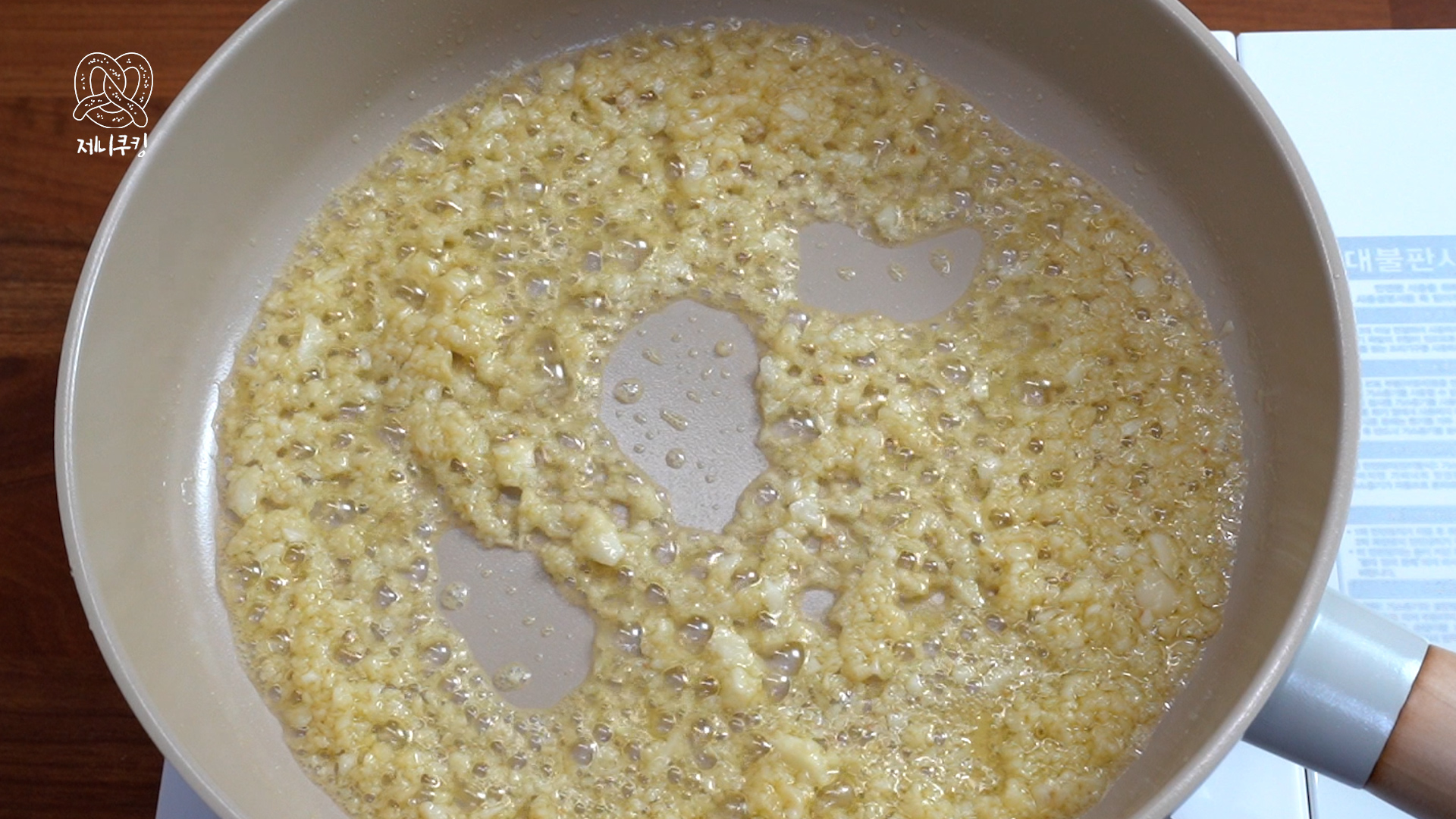 2. 팬에 버터를 녹이고 다진마늘 3큰술 넣어 약불에 타지 않게 볶는다.