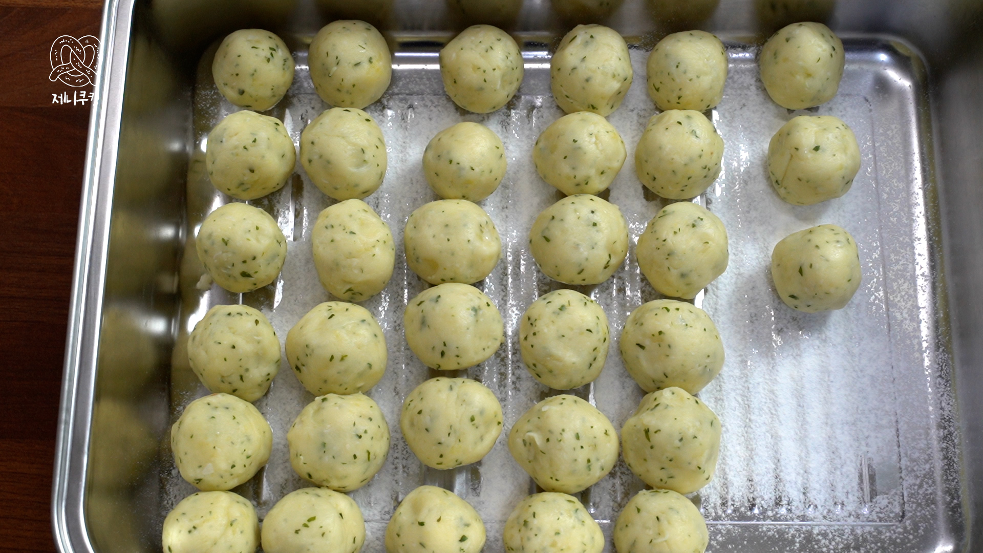 5. 강력분 살짝 뿌린 밧드에 하나씩 올려서 30분 냉동한다.
