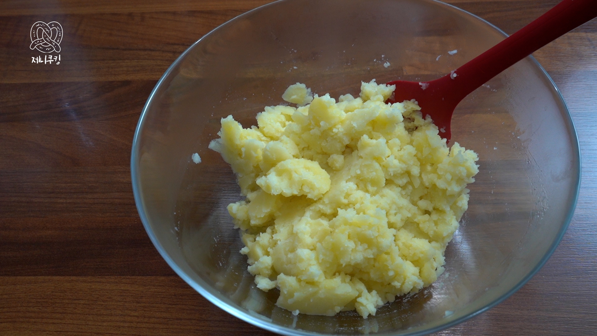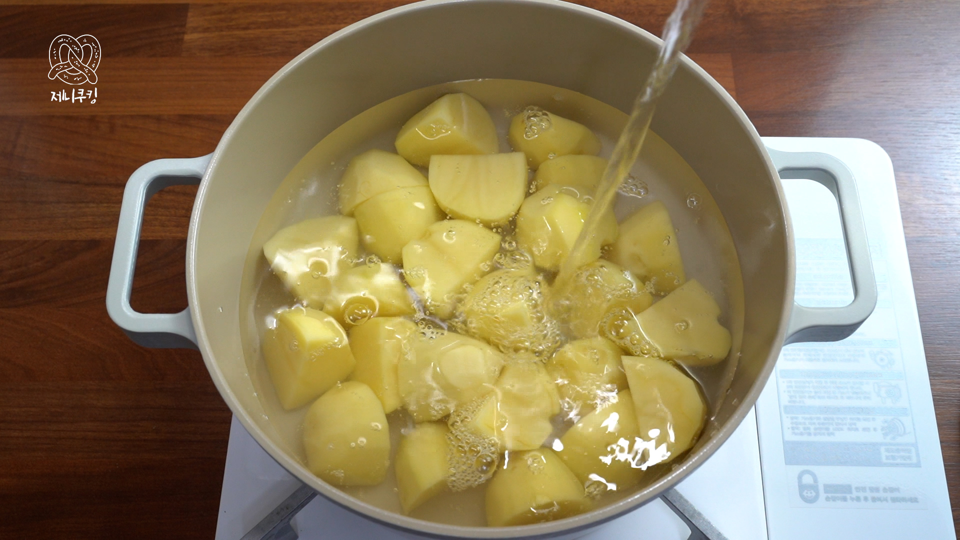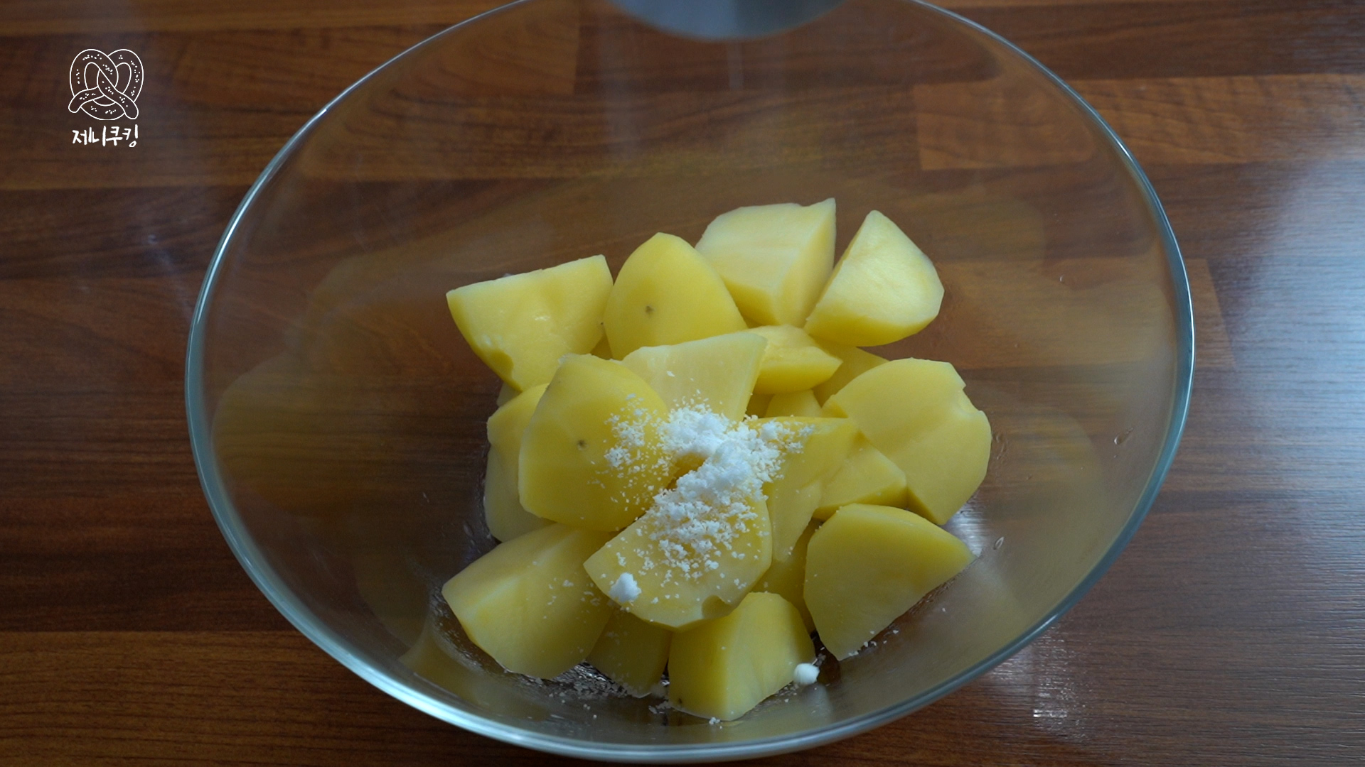 1. 껍질벗긴 감자는 4등분으로 잘라서 삶아준다. 삶은 감자는 볼에 담아 소금 2 작은술 넣고 으깬다.