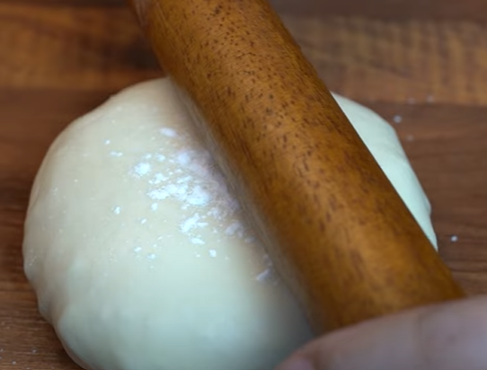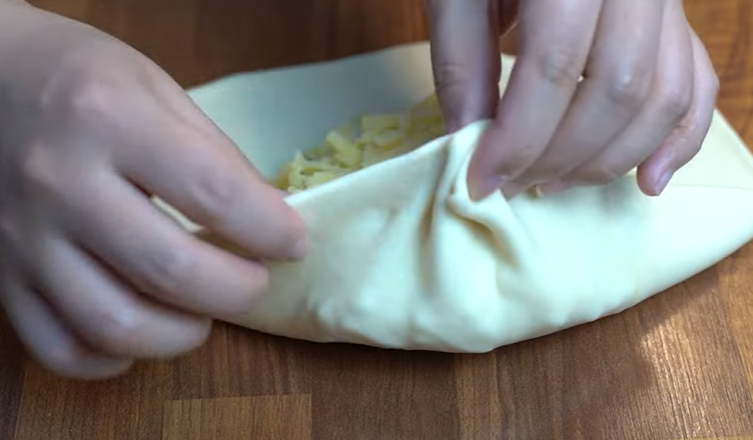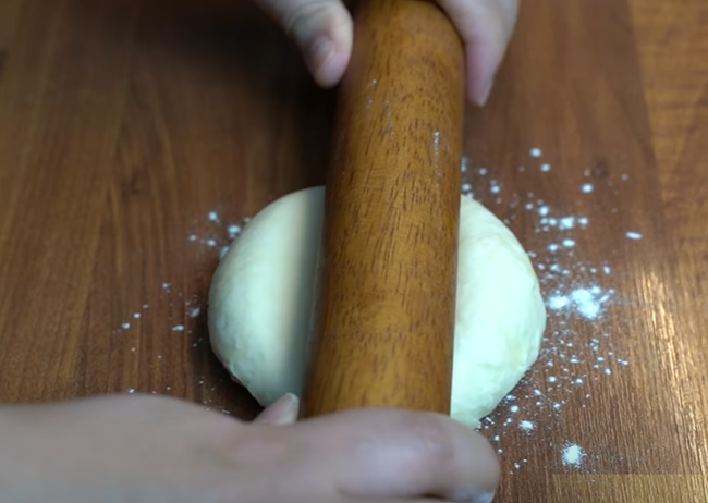 5. 내용물이 터지지 않게 잘 오므려 준 뒤 뒤집어서 밀대로 밀어 편다.