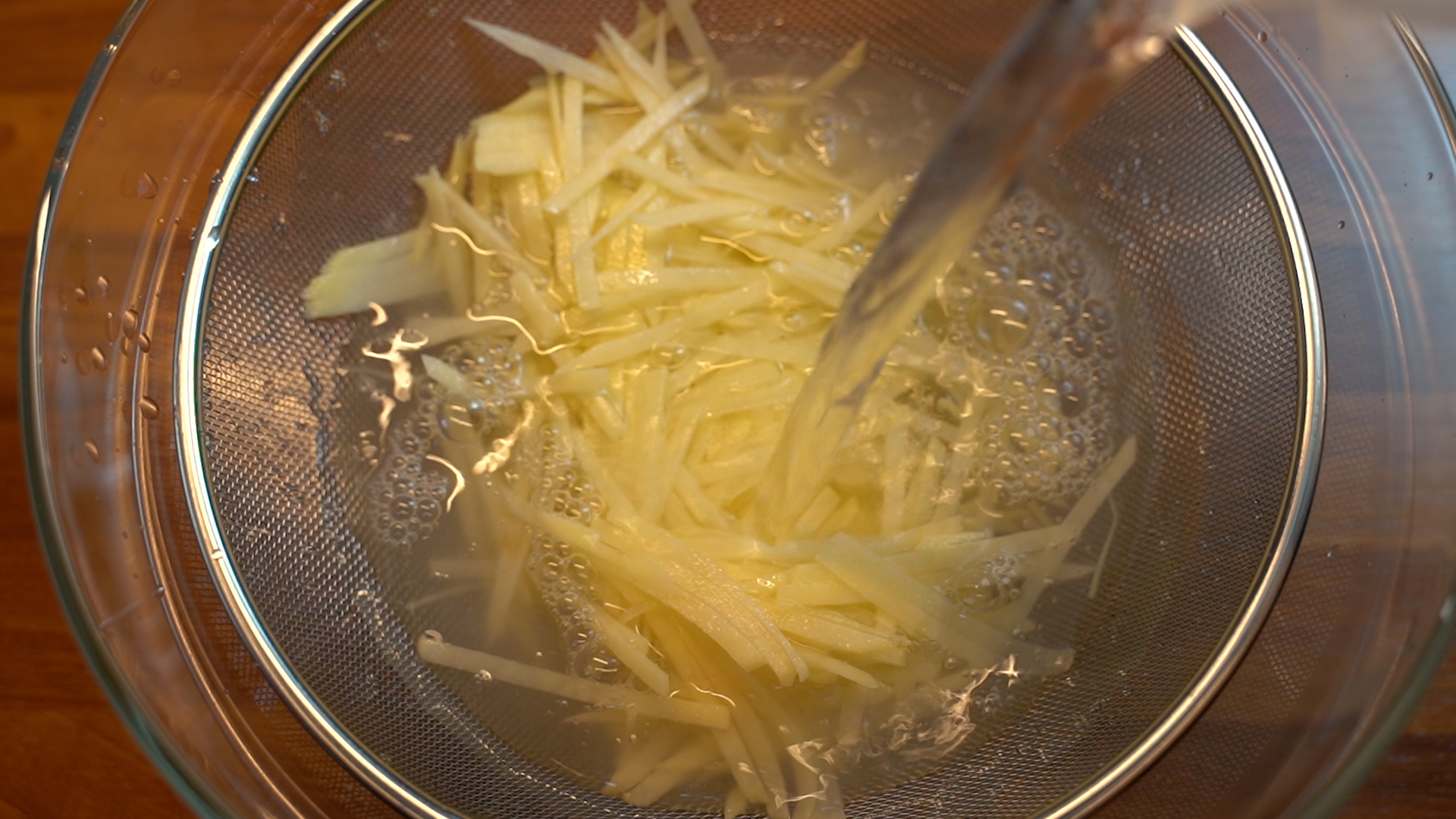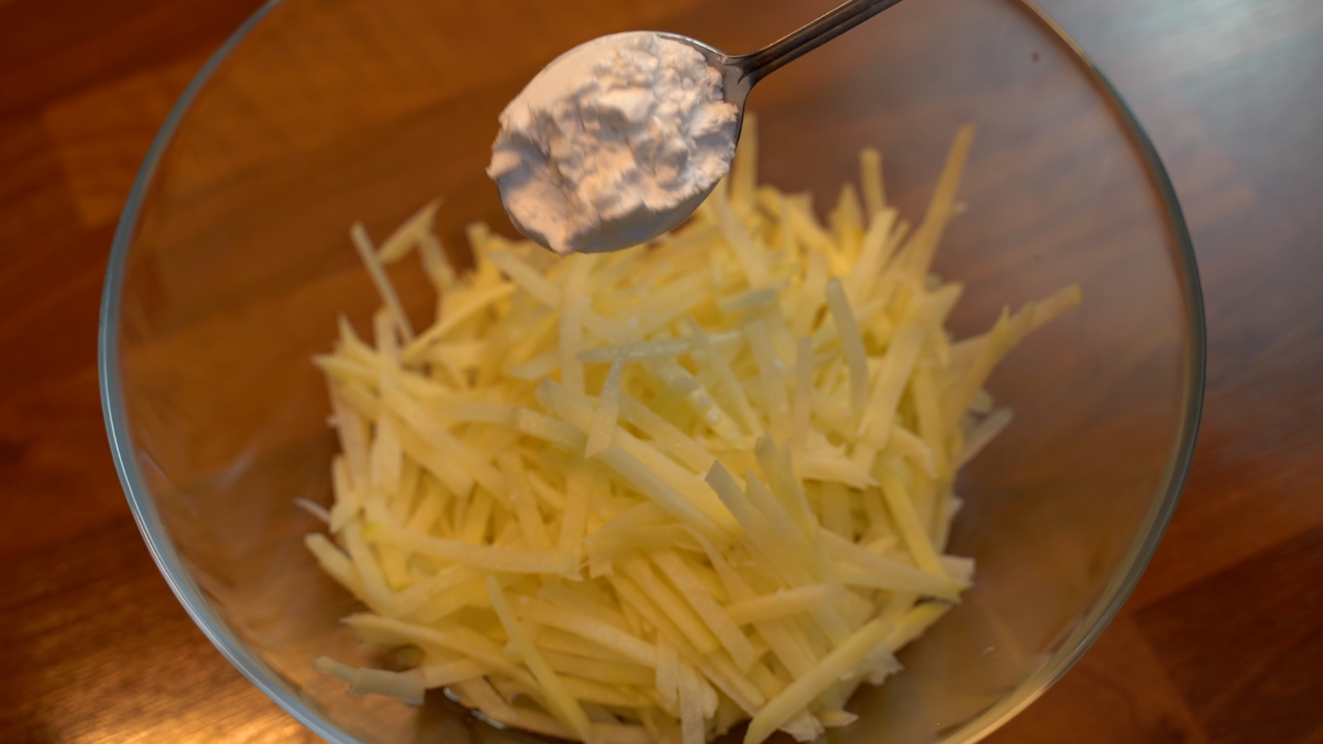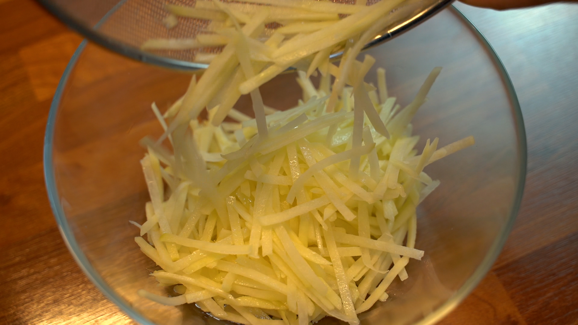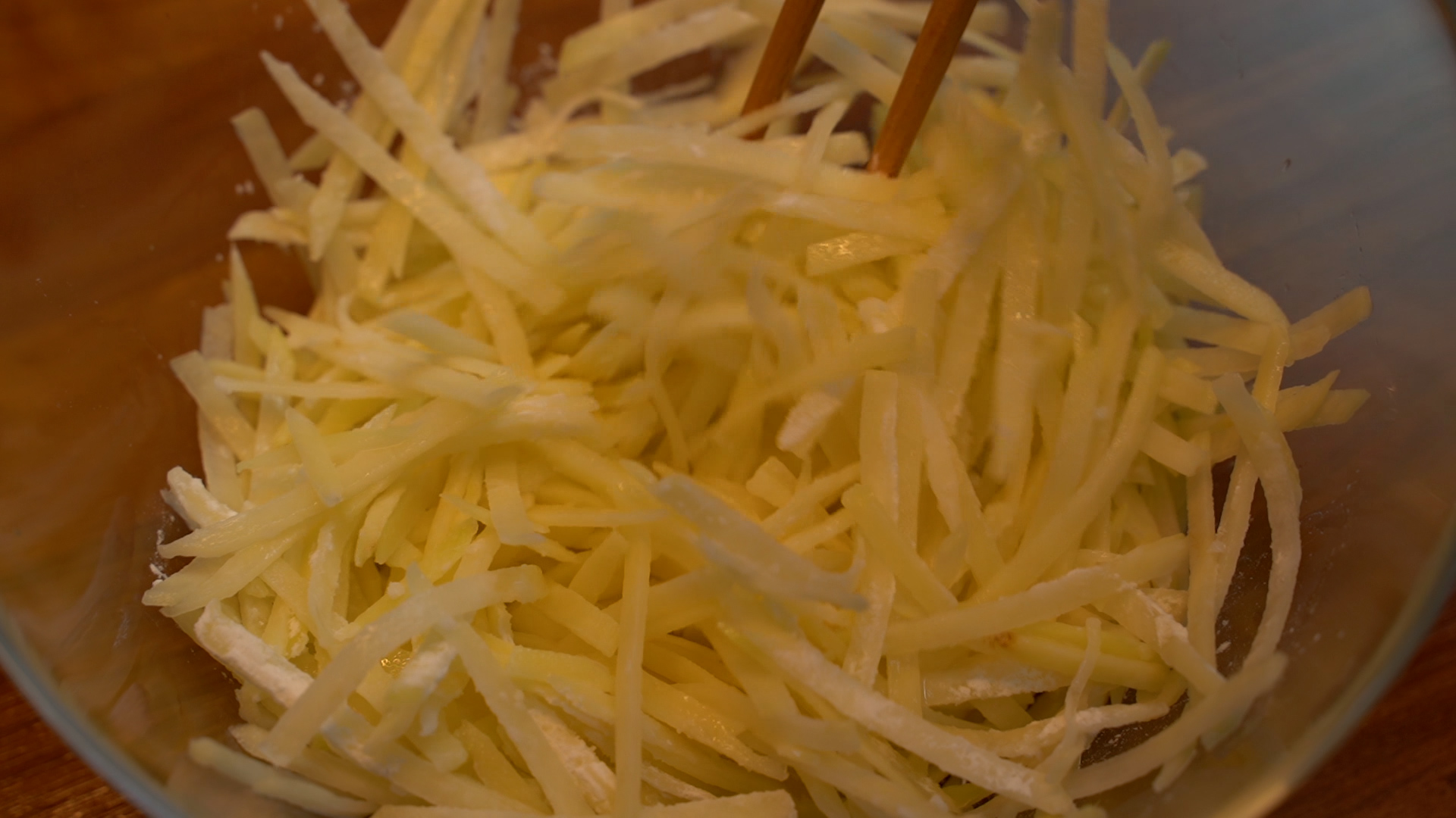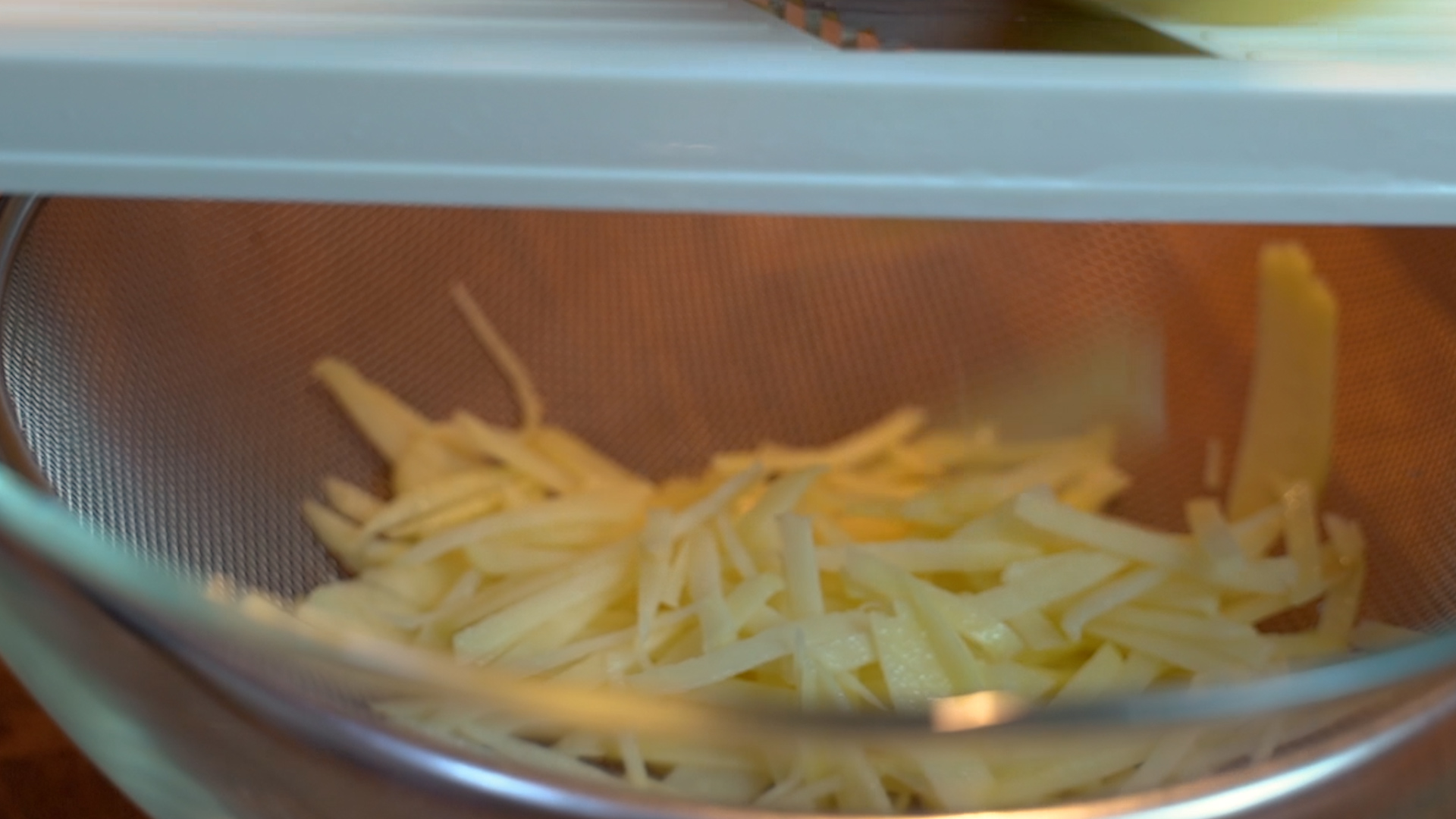 1. 감자를 채칼로 썰고 물에 담가 전분기를 뺀다.