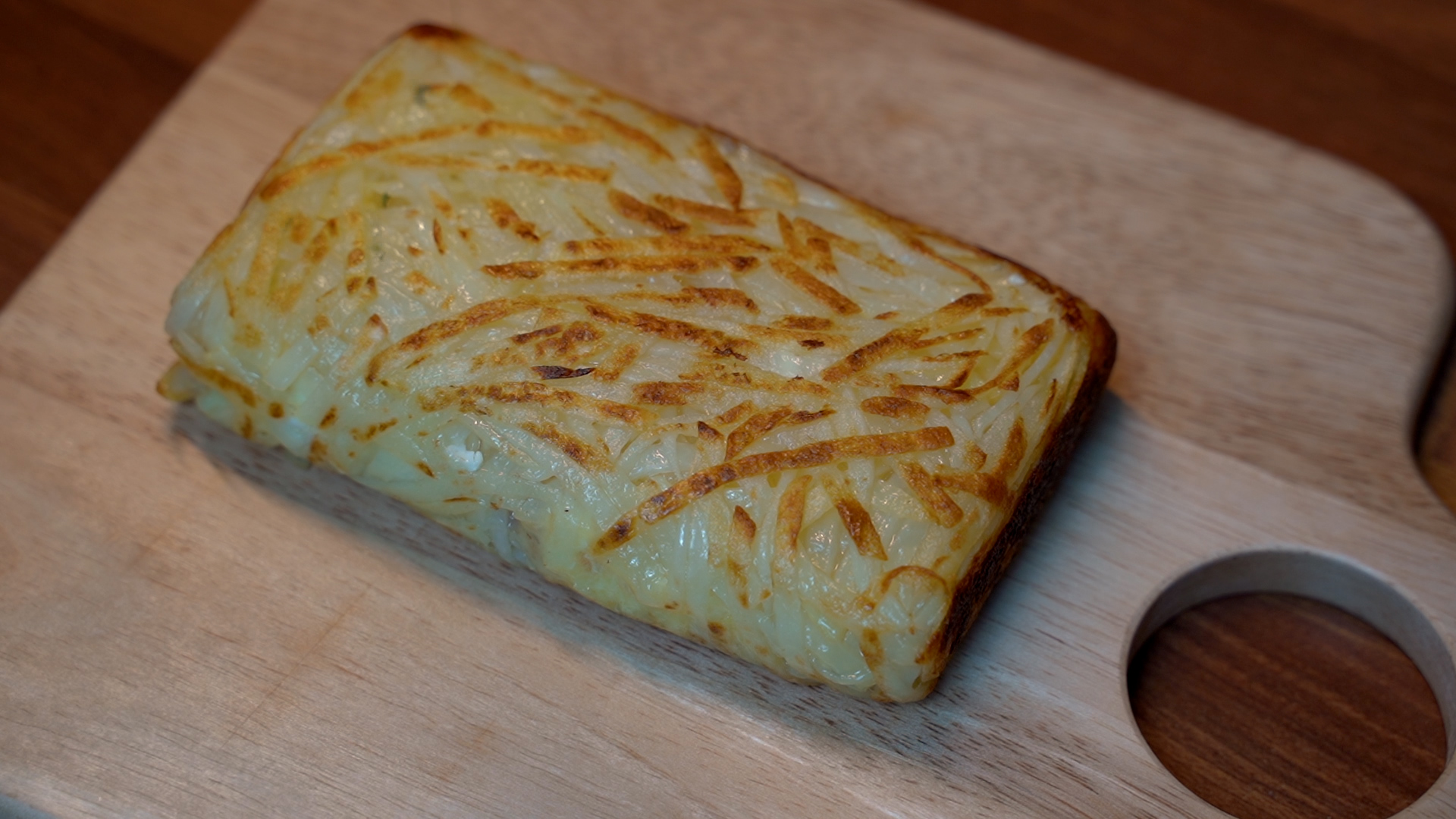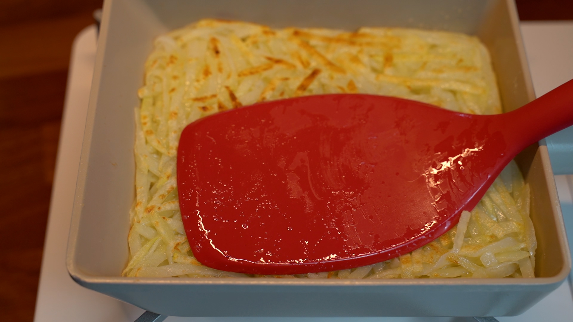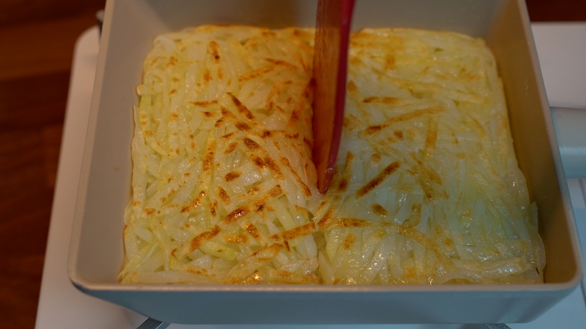 3. 팬에 기름을 두르고 감자채를 모두 올려 꾹꾹 눌러 모양을 잡아준다. (중 약불)